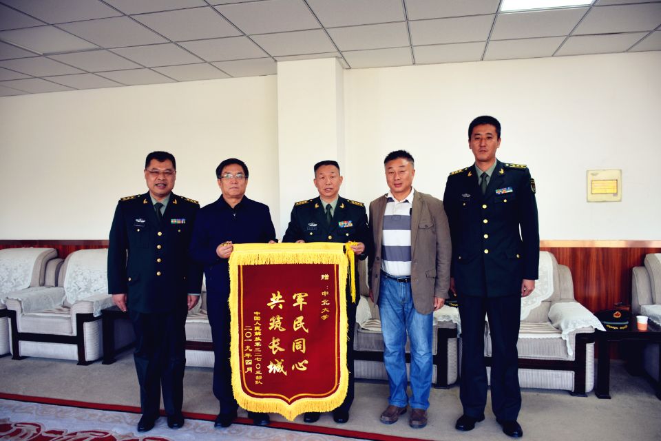 4月16日上午,中国人民解放军太原联勤保障中心政委王洪流大校带领副主任韩崇博上校、副政委郑伟上校来校,向我校赠送了“军民同心,共筑长城”的锦旗。