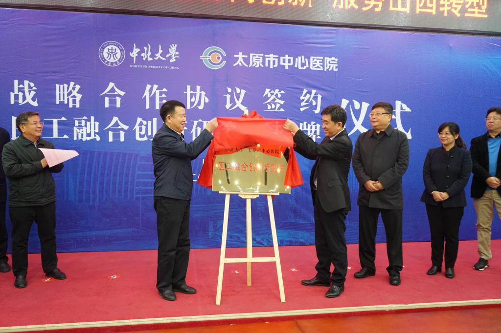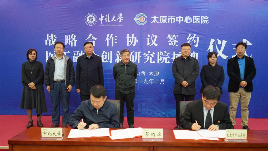为加强医工融合,推进协同创新,服务山西转型,10月16日,我校与太原市中心医院战略合作协议签订仪式在主楼15层会议室举行。我校校长沈兴全与太原市中心医院党委书记赵永生代表双方签署协议,并为“中北大学 ——太原市中心医院医工融合创新研究院”揭牌。